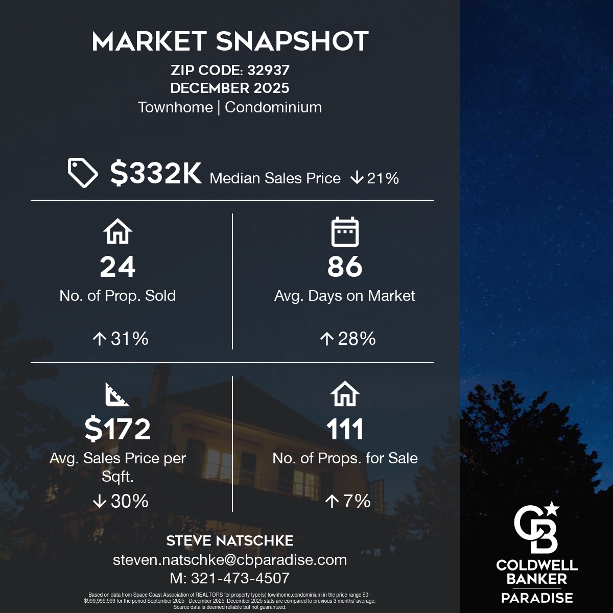 With one exception, the December 2025 numbers are pretty flat and better for the County than the 32937 Zip Code. The overall Median Sales Price rose 2% for the County but dropped 2% for the Zip Code. Single family homes and condos also went in opposite directions – most notably for condos – up 9% for the County and down 21% for the Zip Code. The number of properties sold ranged from 0% to a 34% increase. December is often a busy month for closings. The number of properties for sale has ranged from an increase of 7% to a drop of 15%.